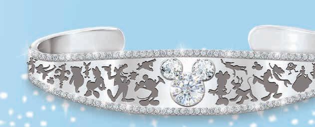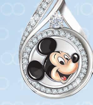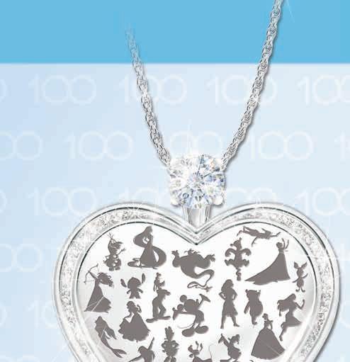 This platinum-plated brass pendant features a heart-shaped design etched with over 25 silhouettes of some of Disney’s most beloved characters. A border of over 70 crystal accents frames the characters and the bale reflects a brilliant shine with a 100-facet crystal solitaire. On the back, the official Disney100 logo is engraved with, ‘Special Edition Year 2023’. Item No. 01-38902-001