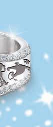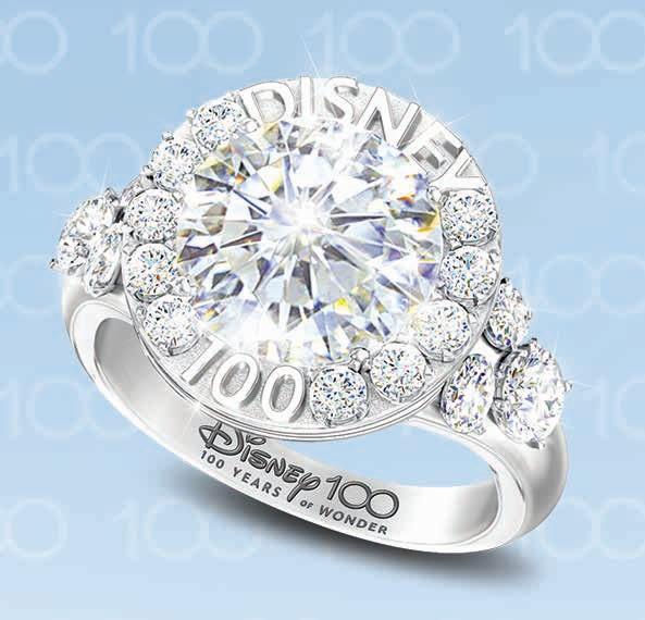 This platinum-plated solid sterling silver ring features a crystal showcasing 100 facets. The multifaceted crystal is surrounded by a halo of crystal accents and a masterfully hand-sculpted message – ‘DISNEY 100’ – to commemorate the Disney100 celebration. The inside of the band is engraved with the official Disney100 logo. Item No. 01-38586
