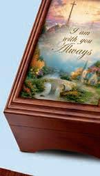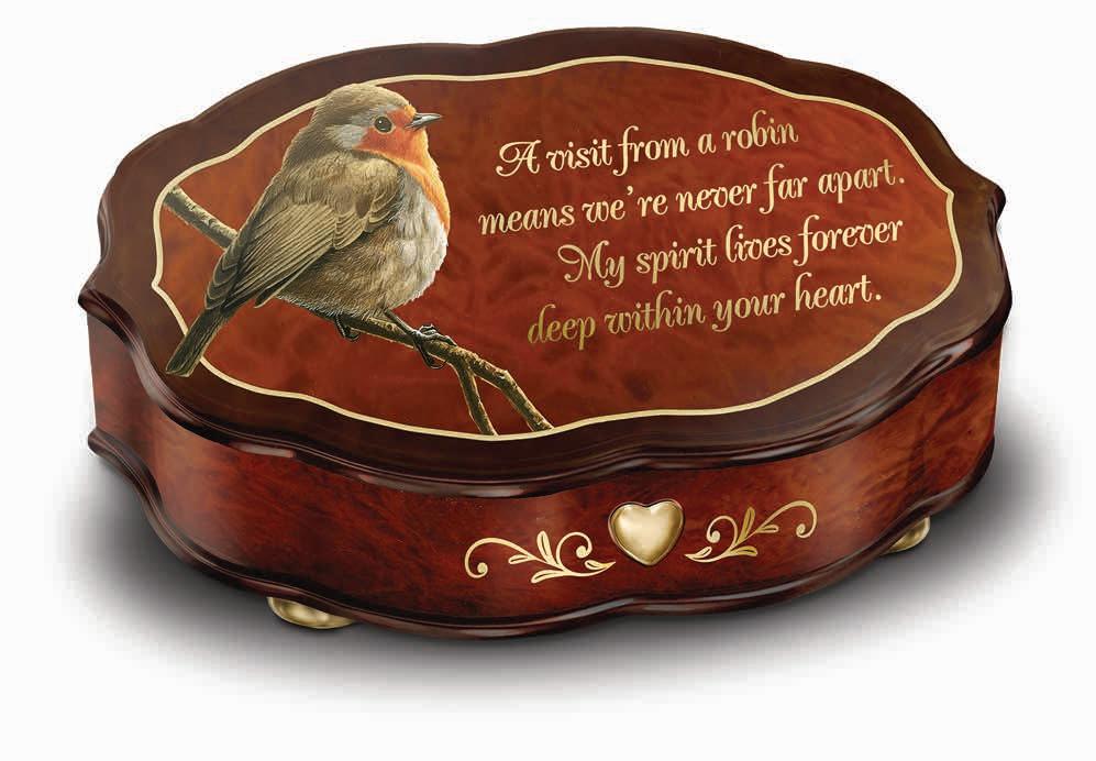 Handcrafted with a design inspired by classic inlaid wood artistry, this music box features the look of burled wood with mahogany and cherry finishes. Showcases the robin art of wildlife artist, Adrian Rigby, and a sentiment. Plays the hymn, ‘Amazing Grace’.