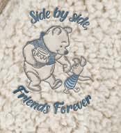 Crafted from soft lightweight sherpa in a classic cream colour. It is lined with a coordinating blue jersey knit throughout the body and hood. Embroidered on the back is blue Disney art, depicting Winnie the Pooh and Piglet. On the jacket front the two are shown, paw in paw, surrounded by the embroidered sentiments: ‘Side by side’ and ‘Friends Forever’. The front also includes two hip pockets and a front zipper.