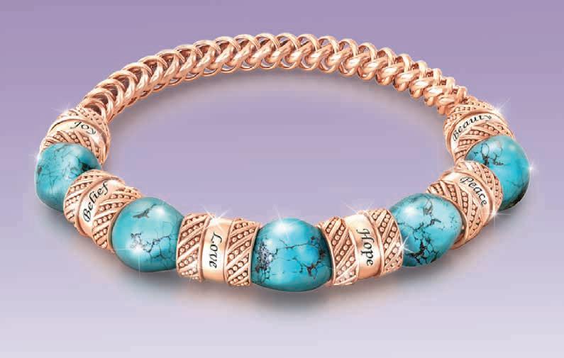 This unique stretch bracelet is handcrafted with five genuine turquoise beads and six solid copper beads plated in 18-carat rose gold. Each copper bead features an engraved word of inspiration – ‘Joy’, ‘Belief’, ‘Love’, ‘Hope’, ‘Peace’ and ‘Beauty’.