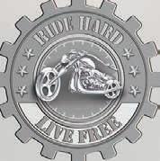 With its distinctive design and clever construction, this watch is handcrafted with a silver-toned face and wristband. The watch face cover is finely etched with an American eagle, patriotic stars and a detailed motorcycle, and the case back is etched with another motorcycle, the words: ‘Ride Hard Live Free’ and a graphic depiction of a toothed gear.
