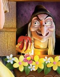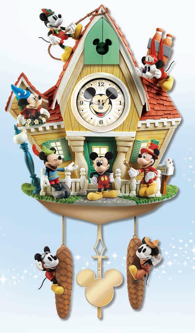 The front of the cottage features the clock face, Snow White and Dopey, while the Evil Queen in her Old Hag form beckons with a poison apple from one of the cottage windows. Down below, Happy, Sleepy, Bashful, and Sneezy work in the diamond mine, while Doc and Grumpy swing on the decorative pickaxe weights that flank the clock’s pendulum. On the hour, the cottage windows and the ‘diamonds’ in the mine light up and the dwarfs take a ride through their diamond mine, surrounded by glowing ‘diamonds’ to the sound of Snow White’s voice.