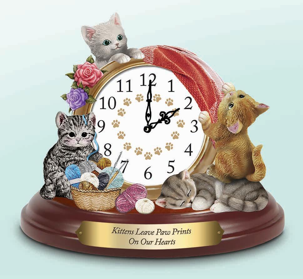 Four sculpted and handpainted kittens are the centrepieces of this clock. At the centre is a precision quartz movement clock with easy-to-read Roman numerals accented with a kitten pawprint pattern. The goldtoned plaque on the base features the inscription, ‘Kittens Leave Paw Prints on Our Hearts’.