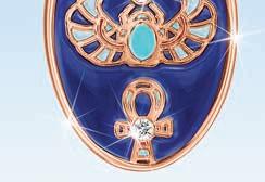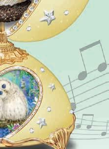 This egg opens to reveal a sculpture of a robin resting on a leafy branch, both of which are painted by hand. Crafted in Heirloom Porcelain®, the outer shell is set with over 90 diamond-like accents in clear and red colours. The curved base features a scene from a painting by British artist Adrian Rigby. This image is framed within an oak-leaf design and raised tracery in 22-carat gold-plating. Plays: ‘Ode To Joy’. Item No. 326-B1026.01