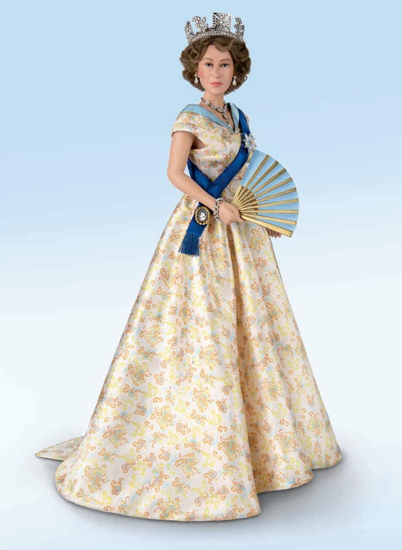This lifelike tribute of Her Majesty is handcrafted in artist’s resin to capture her features displayed in her famous portrait. Her ensemble is inspired by her Norman Hartnell satin evening dress adorned with a fringe trimmed sash, complete with the notable Order of the Garter star. Sparkling accents are inspired by the George IV Diamond Diadem, a diamond necklace that was gifted by the Nizam of Hyderabad, and the diamond bracelet from The Duke of Edinburgh that was given as a wedding present.
