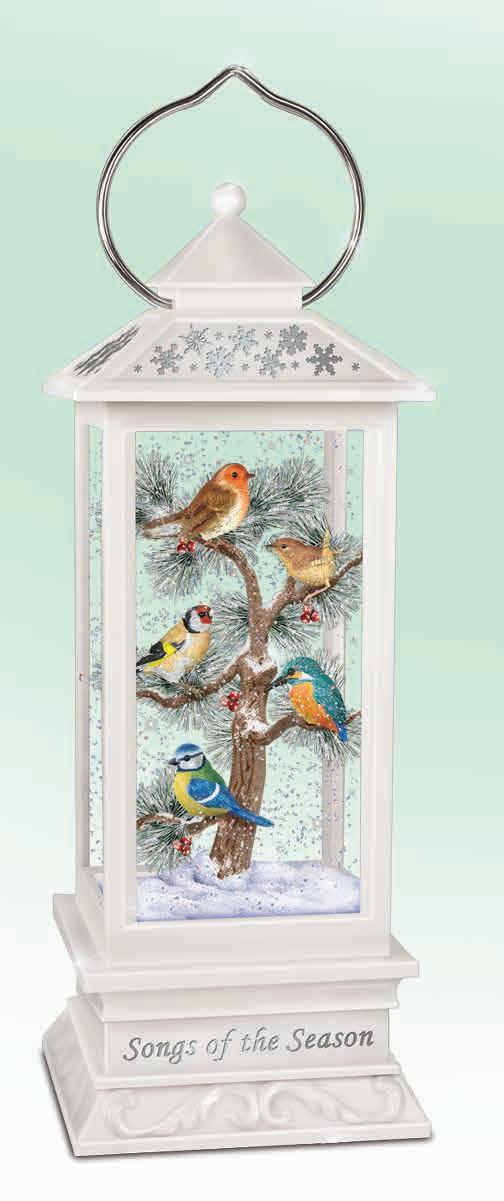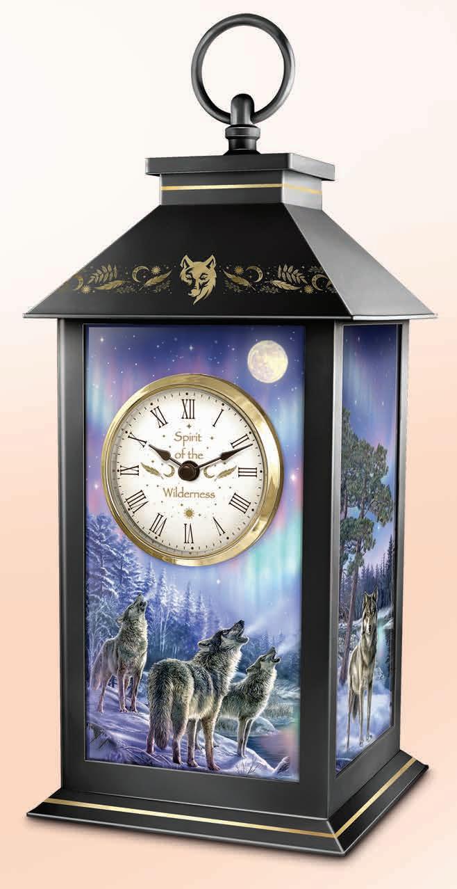 This bronze-toned LED lantern clock showcases stag artwork by Master Artist, Martin Ridley. Each panel features the artist’s imagery. Golden oak leaves and a stag silhouette accent the lantern top, whilst the precision Quartz movement clock with golden rim and Roman numerals captures the sentiment, ‘Let Your Spirit Be Free’.