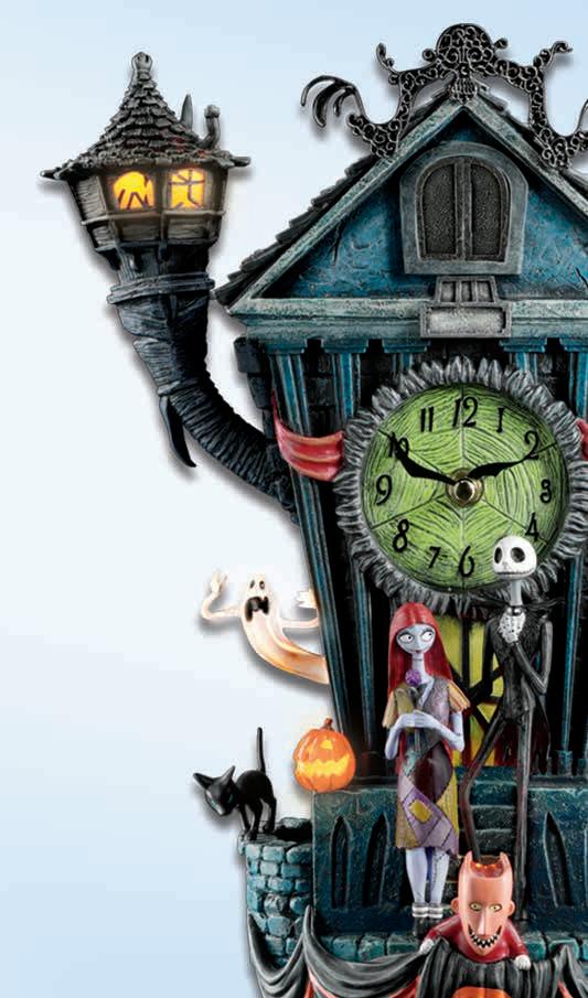 This dimensional timepiece is handcrafted of artist’s resin with timeintensive handpainting to bring it to life. Gathering around the clock are eight characters – including Jack Skellington, Sally, The Mayor, Zero, Oogie Boogie, Lock, Shock and Barrel. An accurate Quartz movement keeps the pumpkin-orange hands circling the off-kilter numbers. As night falls, the moon will glow in the dark with a luminescence.