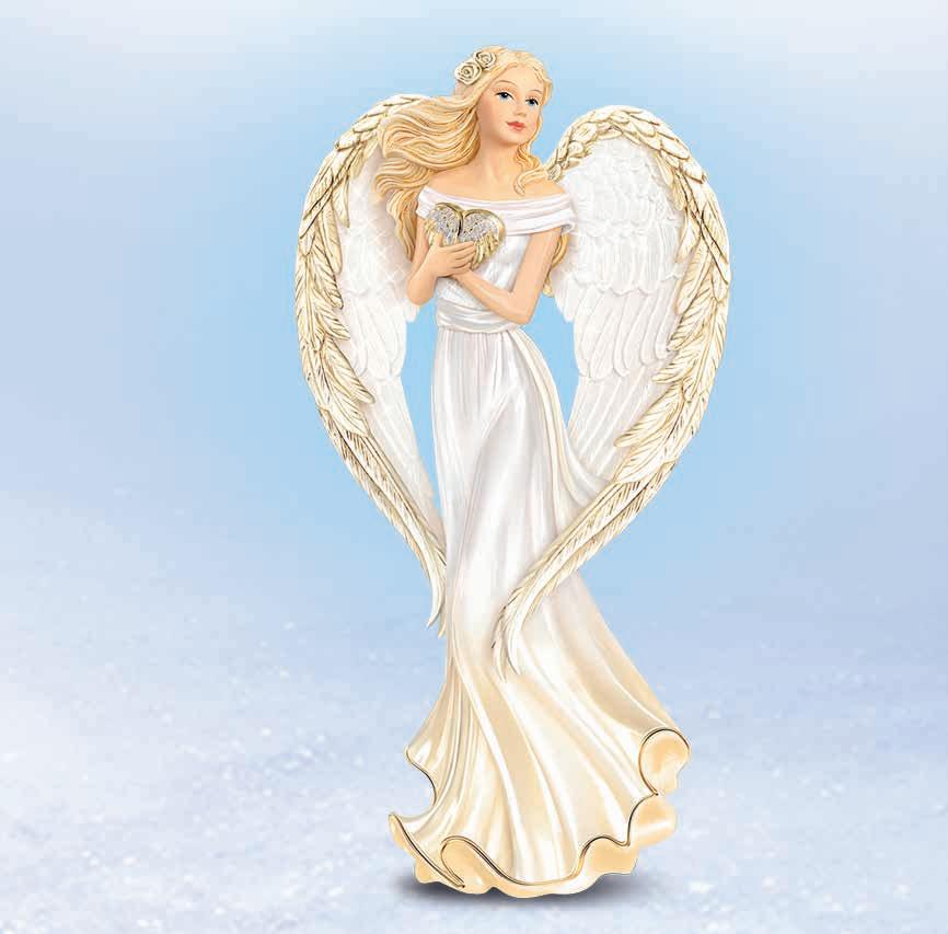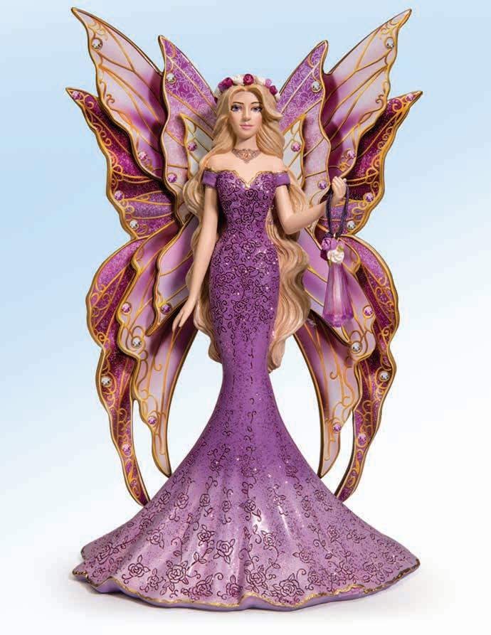 Handcrafted and handpainted by master artisans that work closely with original artist, Sara Biddle. From the layered design of her butterfly-like wings with hand-applied glitter, to the raised-to-the touch metallic golden trim of her etched gown, that boasts a glittery twinkle. She holds onto a simulated crystal with sculptural flowers, with the colour of amethyst.
