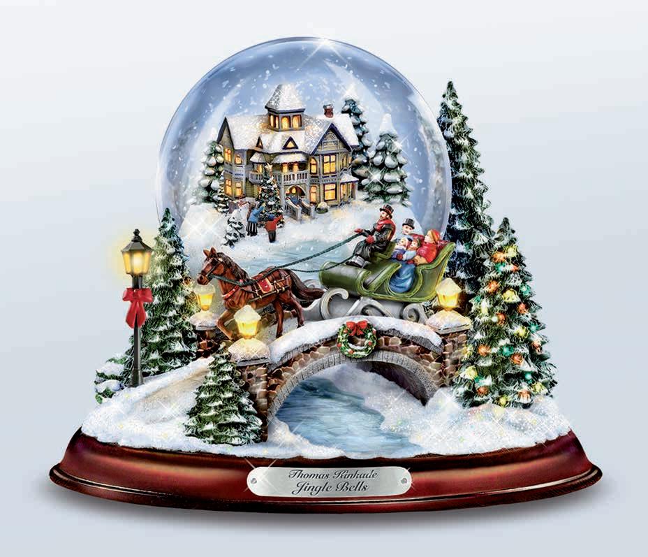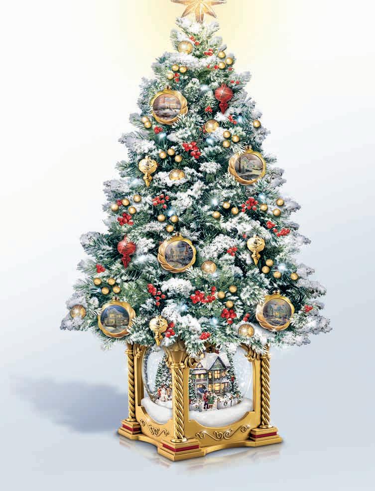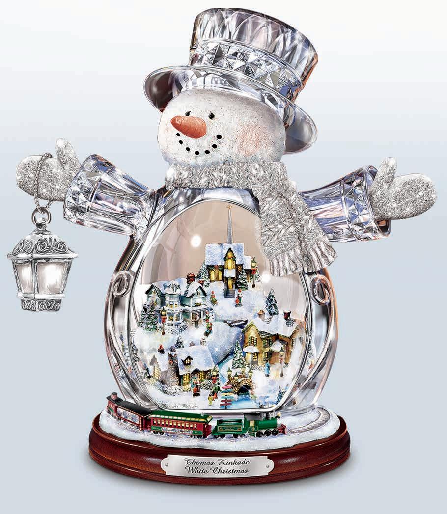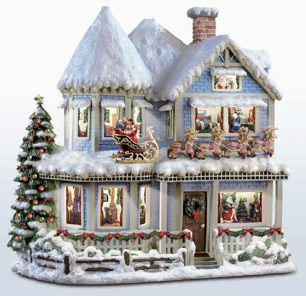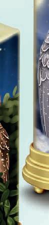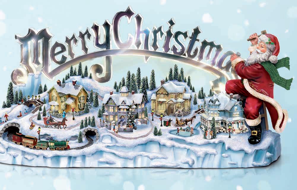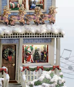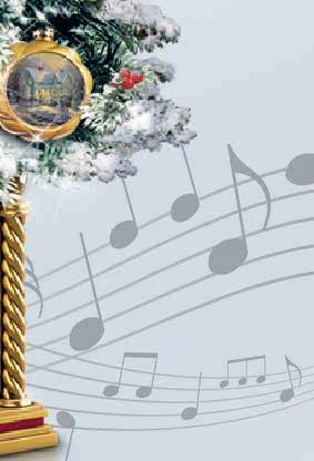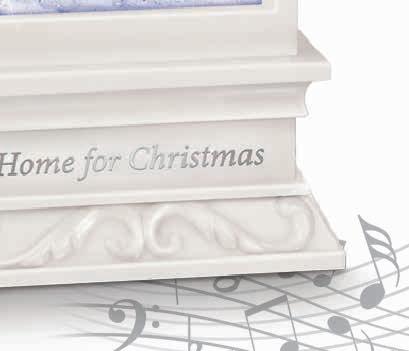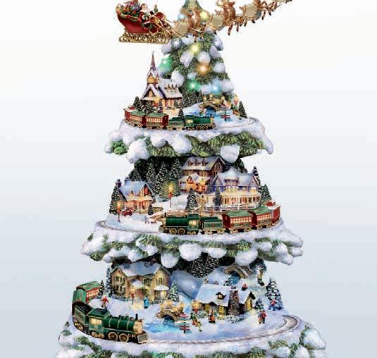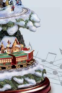 Handcrafted from artist’s resin and handpainted for detail, this grandlysized decoration features a festive village of illuminated buildings, each inspired by a different Thomas Kinkade festive classic. Santa is creating a crystalline ‘ice sculpture’ wishing all a ‘Merry Christmas’. An oldfashioned festive train circles through the snow-covered tunnels while skaters glide on the pond to a medley of eight Christmas carols.