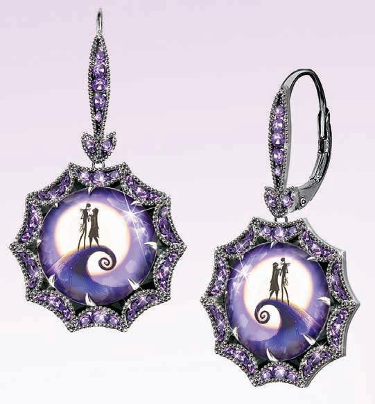 These Jack Skellington and Sally earrings feature a quartz crystal accent over the film imagery framed in a black spiderweb-inspired halo. The pierced-style dangle earrings suspend from lever back closures.