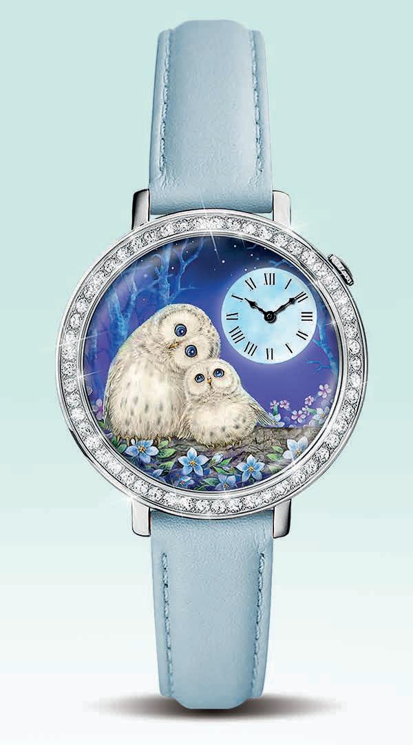 This handcrafted timepiece features a motif by Kayomi Harai of two owls against a moonlit night. The art adorns the dial. The durable stainless steel case is embraced by Svenka™ crystals. Precision Quartz movement and the genuine leather strap.