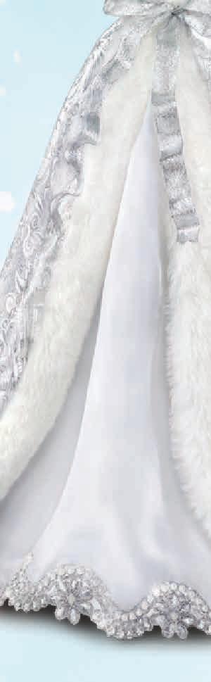This heavenly doll is poseable with a head that turns from sideto-side, and her arms and legs can be gently moved to create a multitude of poses. Her floor-length coat features a silver-and-white brocade pattern tied at the waist with a silver belt. The faux fur trim of her gown is lined with more than 40 LED lights and she plays: ‘Silent Night’.