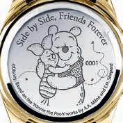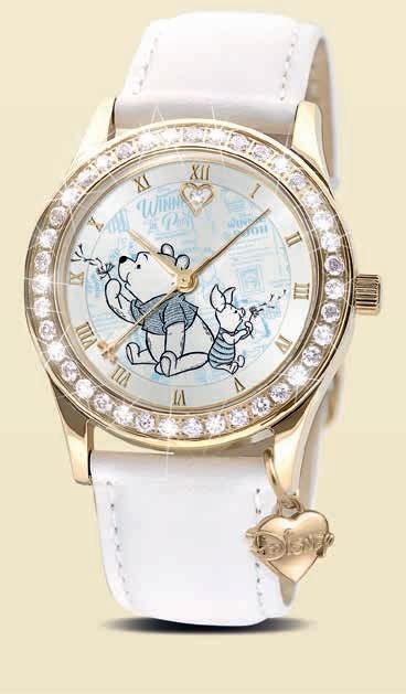 This watch is plated in gold, with white leather strap and a genuine crystal at the 12 o’clock position on the face. Embraced by Svenka™ crystals, the face showcases Pooh and Piglet artwork with background designs inspired by the classic tales and gold-plated hands include a second hand adorned with a tiny bee! A gold-plated Disney heart charm suspends from the strap and the stainless steel casing reverse is engraved with a portrait of Pooh and Piglet hugging, a sentiment, ‘Side by Side, Friends Forever’, and an individual edition number.