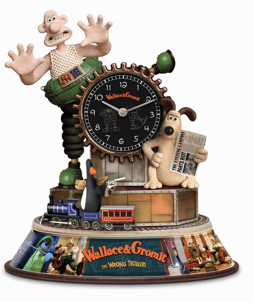 Handcrafted and handpainted. On each hour, a train with Feathers McGraw aboard rotates around the base! Wallace is captured in The Wrong Trousers, whilst Gromit looks on. The main clock is designed to depict a cog – a classic inventor-inspired accent. The base depicts film stills from the animation. Features sound from the animation, heard on the hour! Limited to 4,999 editions.