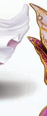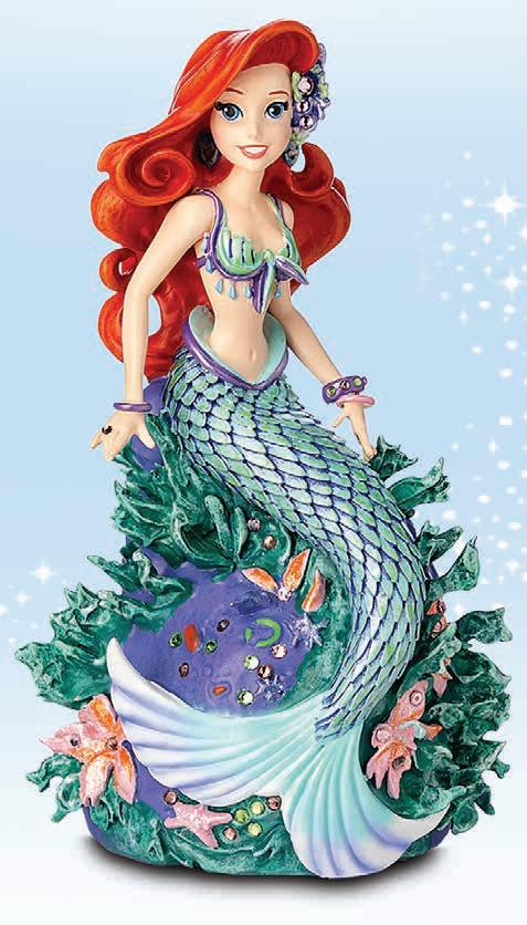 Reimagined in his dazzling style, Bob Mackie’s interpretation of ‘Ariel’ showcases this aquatic heroine, her tail and her top, accented with 40 crystals. Embellished with tassels, bracelet and floral headpiece, Ariel’s outfit is handpainted with a pearlescent finish. Sculpted accents sparkle with glitter.