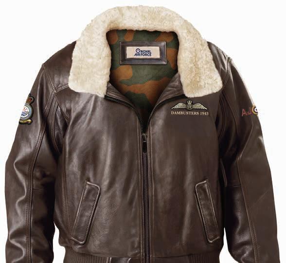 This durable brown leather edition is lined with a camouflage livery of the Dambuster aircraft. It features military insignia – from the golden RAF Pilots’ Wings Brevet on the chest, to the 617 Squadron badge on the sleeve, in turn depicting the squadron motto – Après Moi Le Déluge. The Squadron code letters of Wing Commander Guy Gibson’s aircraft accent the left sleeve, whilst the jacket features a knitted waistband, side pockets, a zipped front closure and a detachable faux shearling collar.