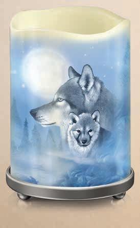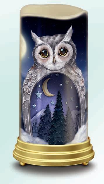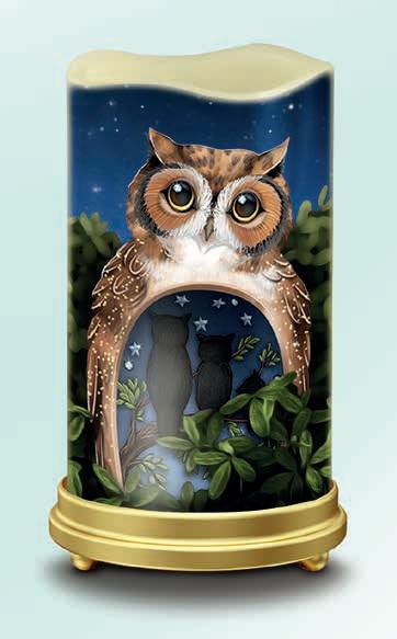 These three handcrafted flameless candles in this set are decorated with owl motifs. Each candle sits within a bronze-toned removable stand. The candles glow with realistic light. Activate the LED lights within each wax-finished candle with the accompanying remote control.