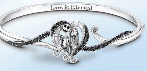 Licensed by Disney and handcrafted in brass with platinumplating, this Disney jewellery showcases Jack Skellington and his love, Sally, sitting shoulder-to-shoulder within a sculpted heart. They are framed by a pavé of over 40 black crystals and the band interior is engraved with, ‘Love is Eternal’.