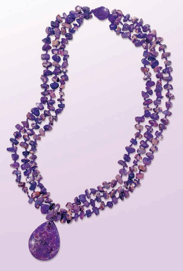 Expertly hand-knotted, the purple turquoise design features three strands of over 200 free-form stones. Each individual stone is a unique size and shape that naturally reflects the shades and hues of purple,. A purple turquoise bail supports a generously sized pear-shaped centre stone. The necklace also has an easy-to-use purple turquoise button closure.