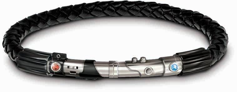 Handcrafted of woven leather in a sleek black, the bracelet’s solid stainless steel centrepiece clasp recalls the pivotal duel by bringing together the Lightsabers of the two opposing forces. The clasp is detailed and sculpted to form miniature recreations of Darth Vader’s and Luke Skywalker’s original Lightsabers. The eye-catching design with black ion-plated accents also gives a colourful nod to both of their signature weapons, along with simulated blue and red Kyber Crystals.