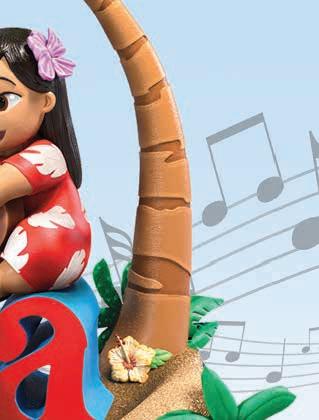Handcrafted of artist’s resin with fully-sculpted figures of Disney’s Lilo and Stitch, handpainted in colours true to the film. Stitch is showcased surfing within a real glass globe - shaped like the ‘O’ in ‘Ohana’ – with a gentle shake, glitter reminiscent of tiny water droplets swirls. The base recalls the words, ‘Ohana means Family, Nobody gets left behind or Forgotten’, along with raised relief, hibiscus flowers and textured ‘sand’. Plays a melody from the movie with just the turn of a key, shaped like Pudge the fish.