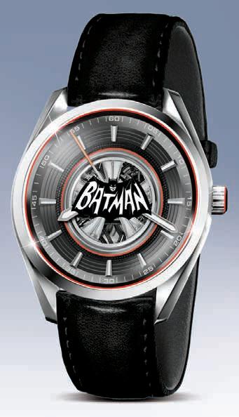 Showcasing design elements inspired by the Batmobile, this watch features an angled case design recalling the Batmobile tail fins, and red-orange detailing mirroring the pinstriping on the Batmobile’s black paint job. The brass case boasts stainless steel ion-plating, and the stainless steel back is etched with BATMAN™ icons. Limited to 1,966 editions.
