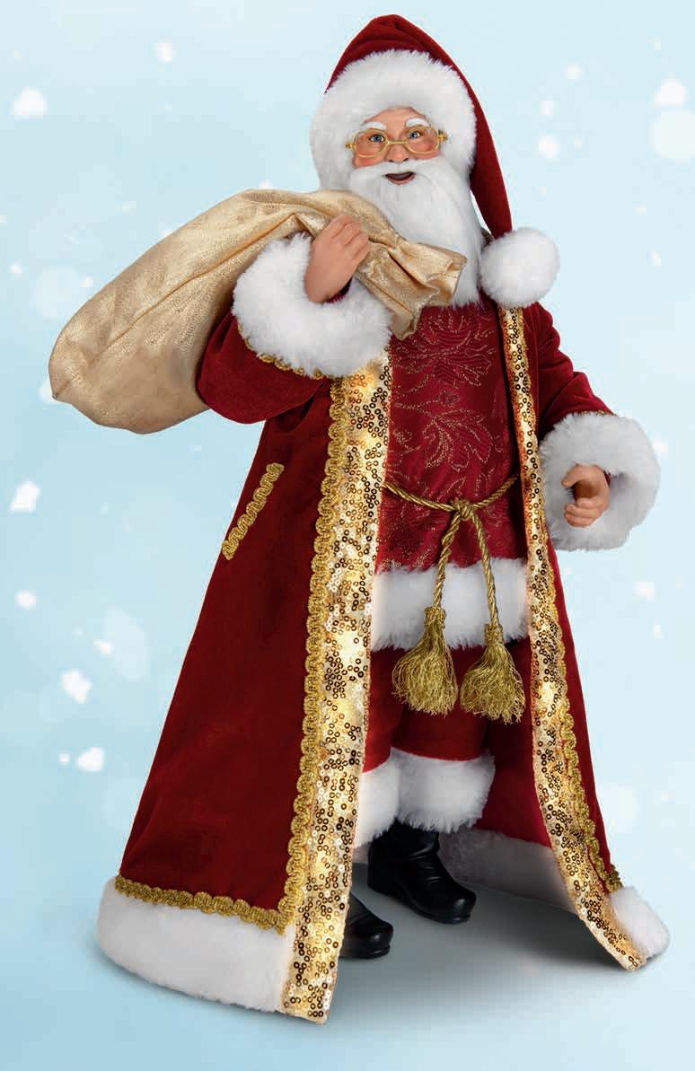 Handcrafted by our master artisans from artist’s resin, this festive doll is handpainted. His lifelike beard is hand-applied and golden wire-rimmed glasses perch on the bridge of his nose. His classic red suit is handtailored and accented with faux fur, gold sequins, and gold-trimmed pockets. Beneath his coat, he wears a red and gold brocade vest, trimmed with faux fur.