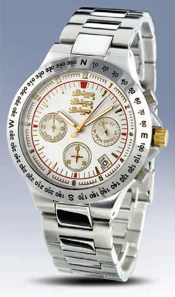 Handcrafted from durable stainless steel and finished with rich gold-plating. Engraved on the side with ‘Courage, Honour, Pride’, the precision Quartz movement chronograph also depicts the St George’s Cross and crucial dates from English heritage on the reverse in addition to your individual edition number. The three gold-plated lions on the face are reflected in precision-etched detail on the watch clasp. Limited to 4,999 editions.