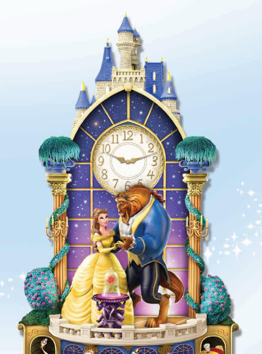 This enchanting, wall clock is handcrafted and handpainted to capture each character’s unique charm. The colours, characters and romance of Belle and Beast’s big ballroom moment are recreated with vivid detail and emotion in three breathtaking dimensions. Lining the tier below the couple are Cogsworth, Lumière, Mrs. Potts, Chip, Plumette and Sultan. At the top of each hour, the clock plays a beloved melody from the movie while the bottom tier rotates, sending the supporting cast of characters around in a joyous, celebratory ‘dance’.