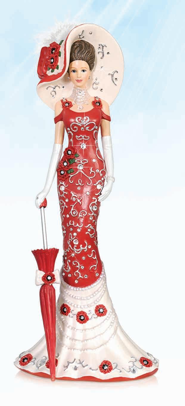 Handcrafted of artist’s resin, then handpainted. Her custom-designed skirt glows with LED lights. At the touch of a button, she plays: ‘Carol of the Bells’. Her outfit is fashioned from fine chiffon and silvery sequin-accented metallic organza and she dons jewelled earrings and a silver bolero jacket with faux fur on the cuffs and collar.