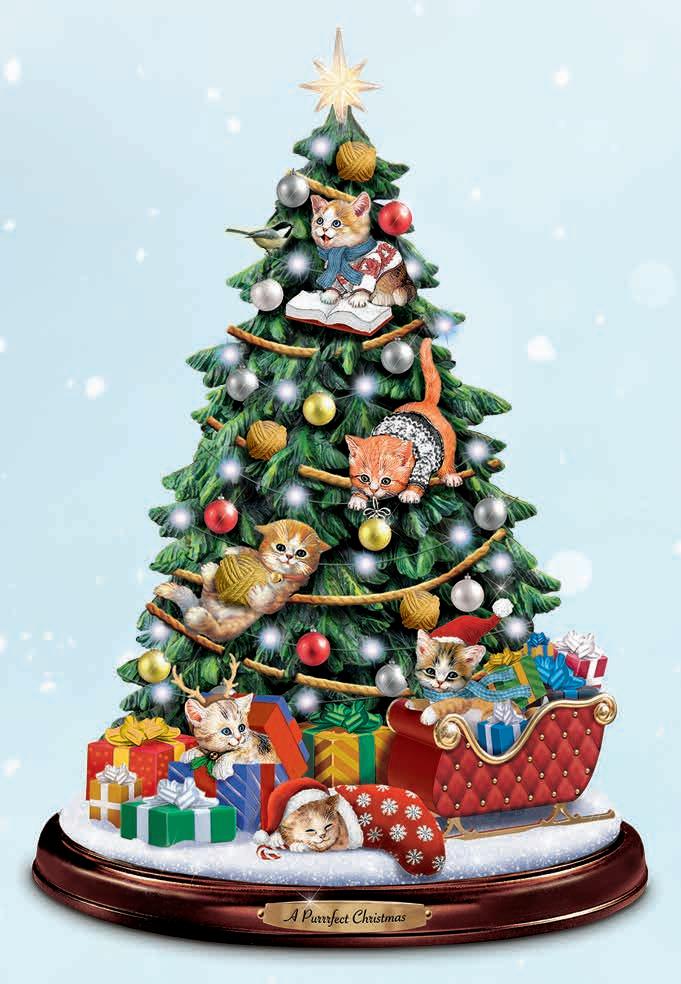 This handcrafted tabletop tree is fully-sculpted and adorned with colourful ornaments and sculpted garland on the boughs. This tree features mischievous kittens, each hand-cast to capture the wide-eyed wonder of Jürgen Scholz’s famed felines in handpainted detail.