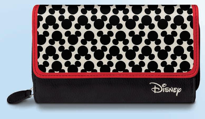 The front of this licensed purse features a repeating pattern of Mickey Mouse ears. Crafted of black faux leather with red accents and silver-toned hardware, this edition has 13 credit card slots, a photo ID window, and five different slip pockets.