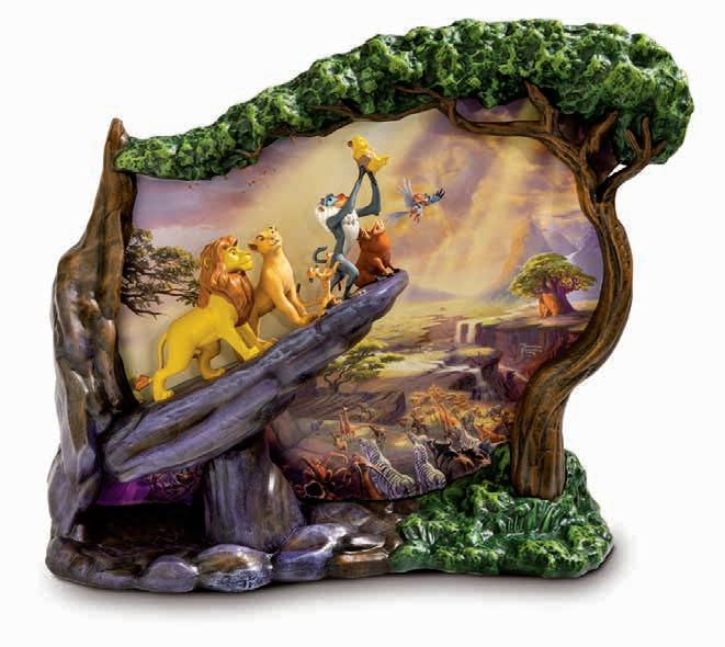 Handcrafted of artist’s resin and handpainted, at the forefront of this sculpture are 6 sculpted characters standing atop Pride Rock, recreating a classic scene from the movie. The sculpture comes to life against a backdrop featuring artwork from Thomas Kinkade Studios best-selling painting, ‘Disney The Lion King’. Delight in the wealth of details, from Rafiki’s tree with his drawing of Simba on the trunk, to Disney’s Mufasa in the clouds. The sculpture features a bottom stamp of the film’s official 30th anniversary logo. Edition limited to 3,000 worldwide.