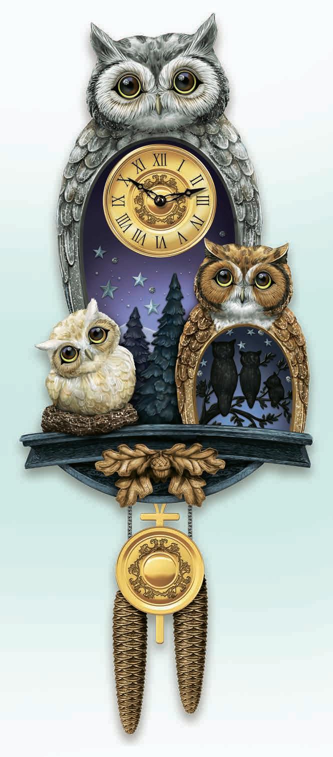 This handcrafted and handpainted wall clock is inspired by Blake’s original art and captures a family of owls. Etched ‘feathers’ on each owl’s wings and atmospheric reliefs within. Owl calls sound, every hour.