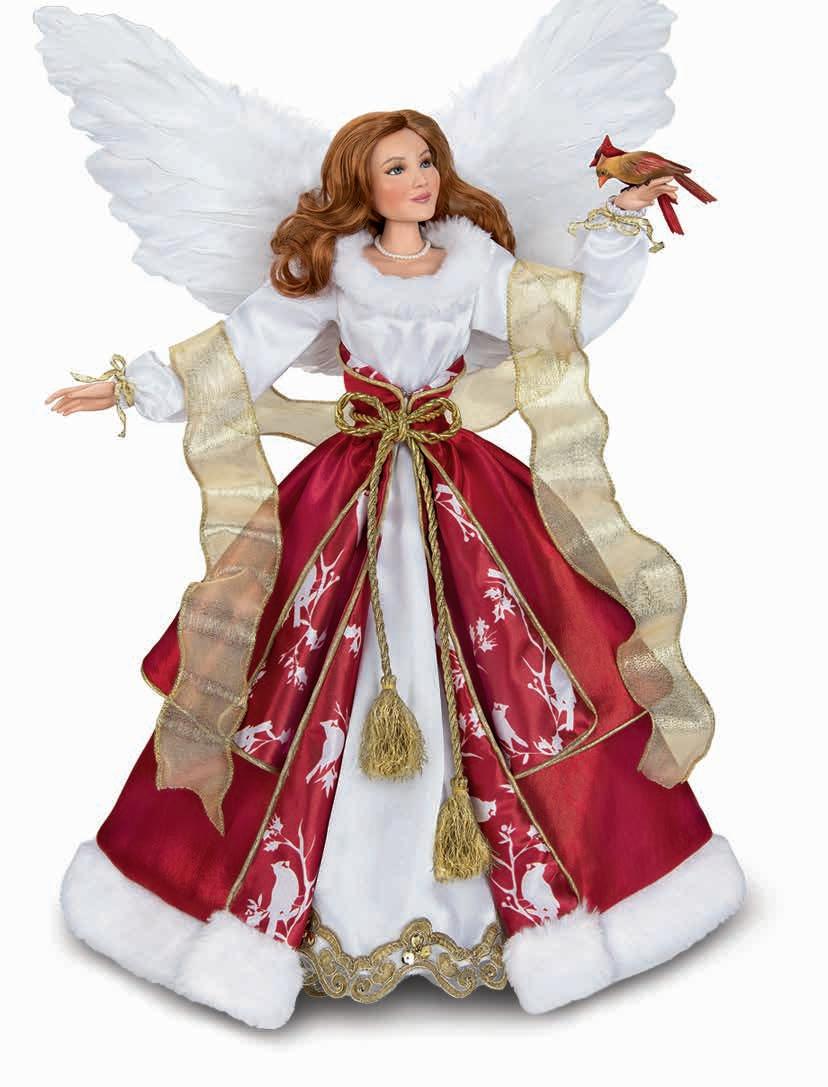 Handcrafted of artist’s resin and handpainted, this poseable angel holds a cardinal duo. She boasts faux feather wings and an ensemble featuring a removable, reversible outer skirt with a cardinal design, crafted from cranberry and white satin and accented by faux fur and golden ribbon. At the touch of a button, she plays four classic carols.