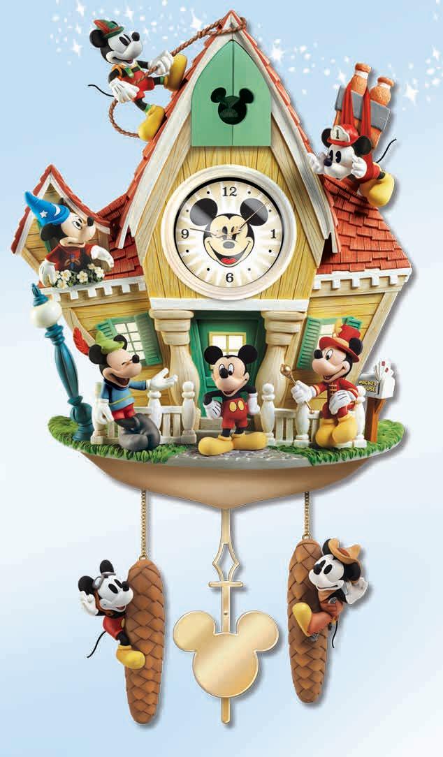 This Disney wall clock features 9 Mickey figures from some of his most memorable appearances. From his magical mishaps as the Sorcerers Apprentice in ‘Fantasia’ to the musical distractions he faced in ‘The Band Concert, these figures come to life around a cartoon cottage. LED lights illuminate the windows, while on the hour the original Steamboat Willie emerges from the attic window to the sound of the original Mickey Mouse Club theme song.