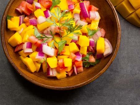 Before you get started, make sure your mango is ripe! It should be soft to squeeze and the color of the skin should be mostly red or yellow. You can also tell if it’s ripe by the stem – if there’s a yellow circle around it, then it’s ready to use. Then cut the mango into cubes and dice the others veggies as well.