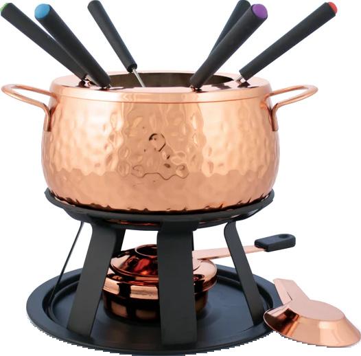 An impressive fondue design meant for cooking meat tableside in oil or broth.