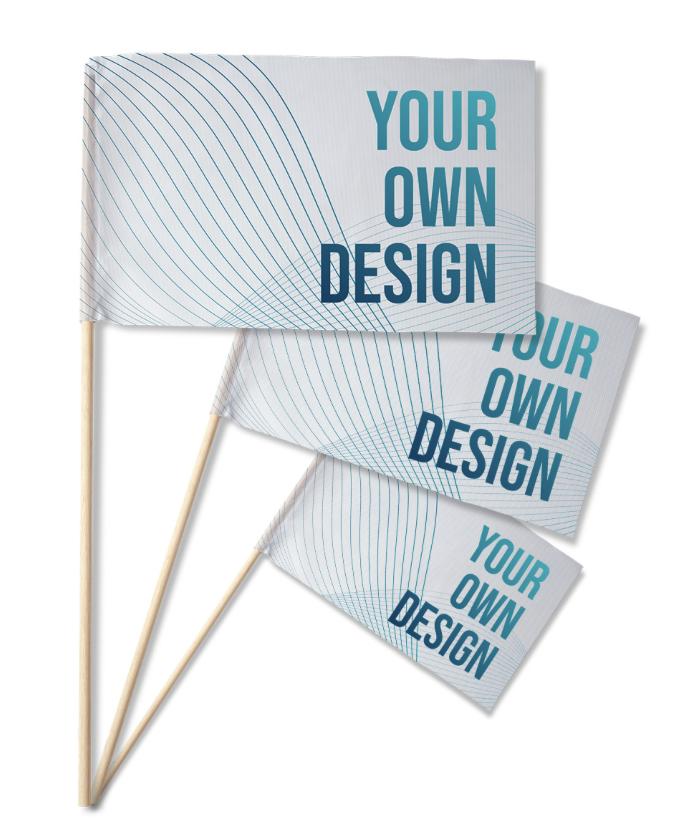 Flag med skaft: af polyesterstof 115g/m2, 100% polyester, uden syning i kanten, sublimation, med poleret skaft af 12mm Ø.