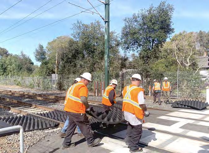 Caltrain crews have installed panels with soft rubber cones that are difficult to walk across to improve safety at the Churchill Avenue crossing. Palo Alto City Council on Monday voted to hire security guards to watch the crossing 24/7 for the next year while the city pursues a temporary closure. Post photo by Braden Cartwright.
