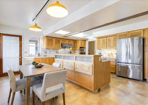 • Remodeled designer kitchen with island seating, vaulted skylight, quartzite counters, and high-end appliances