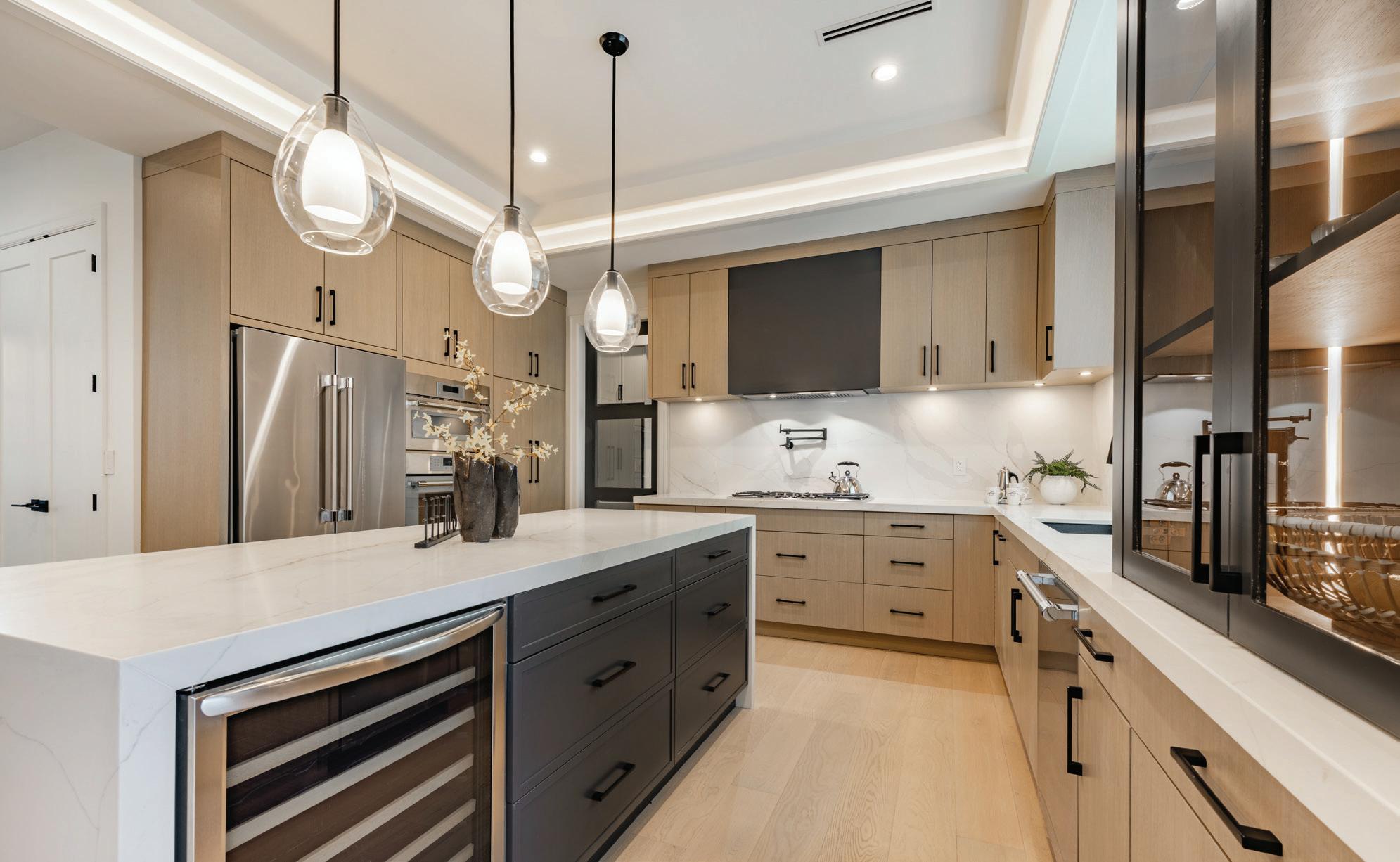 • Chef’s Eat-in Kitchen Features a Center Island, Viking Appliances, and a Skylight