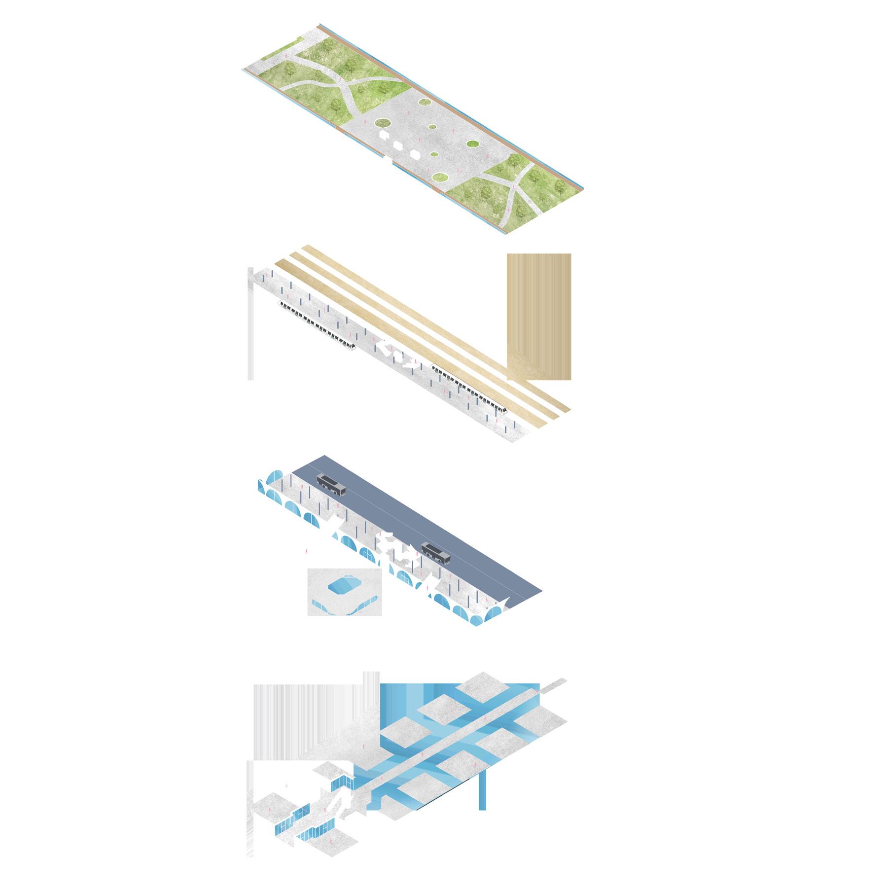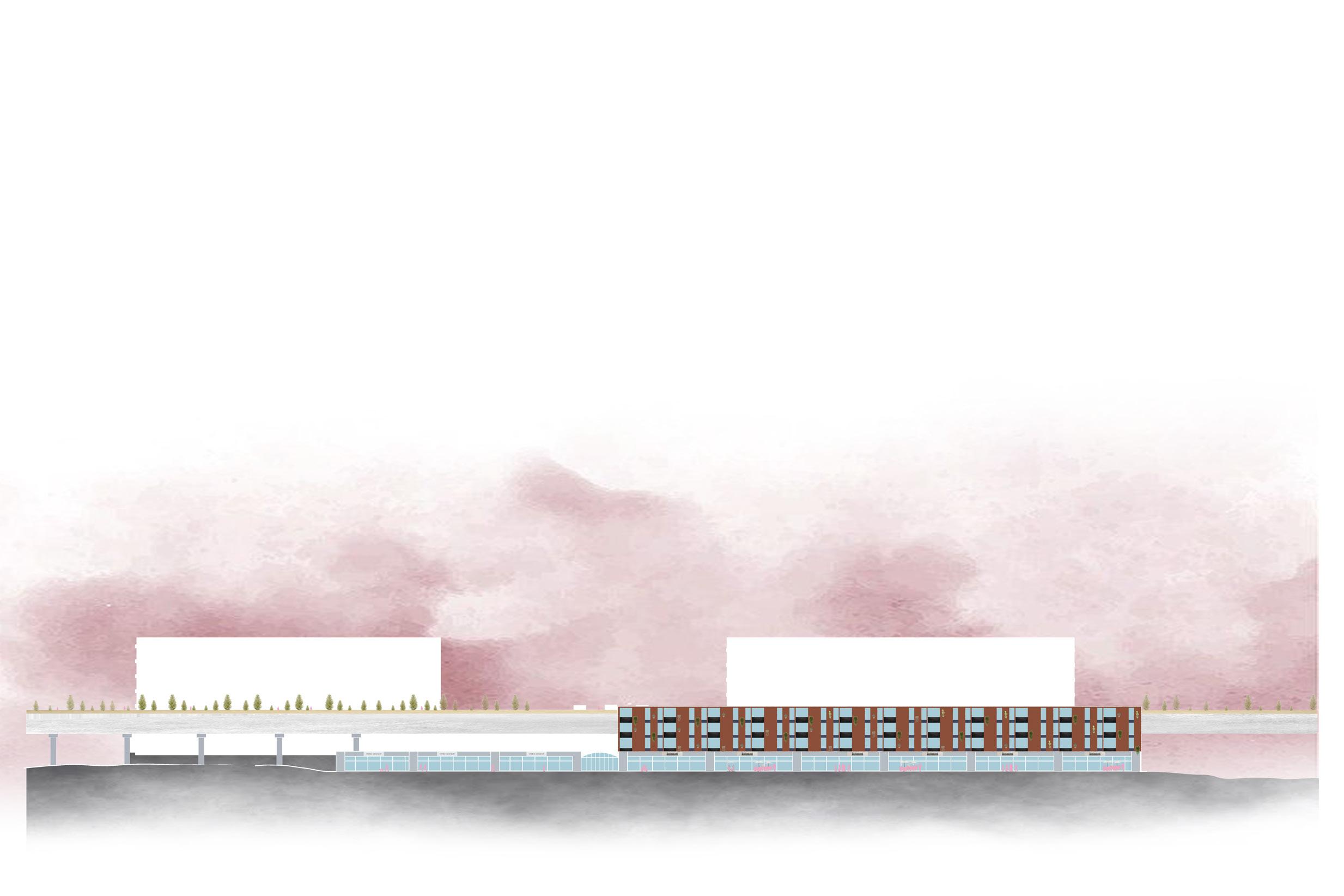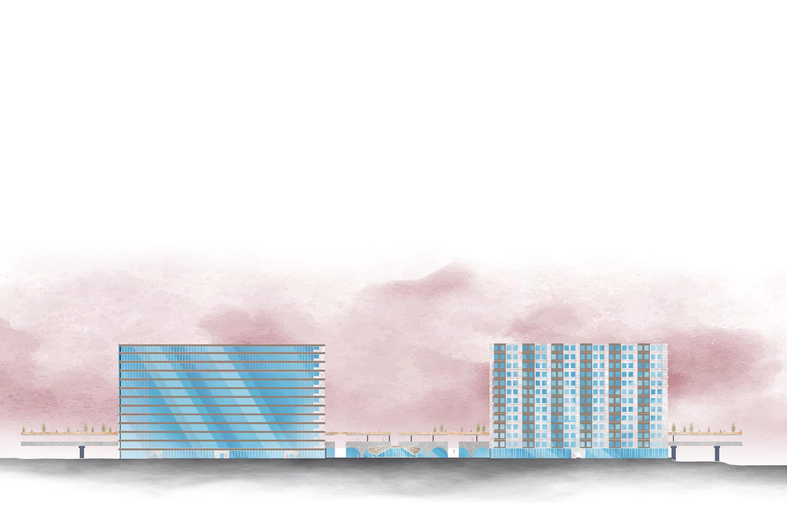 LINEAR PARK DESIGNED DIRECTLY ON TOP OF THE RAILS TO BRING CONNECTION FROM THE SITE CONTEXT. MIX-USE HOUSING DEVELOPED WITH THE ADDITIONAL SPACE PROVIDED, BINDING THE BUILDING AND THE LINEAR PARK.