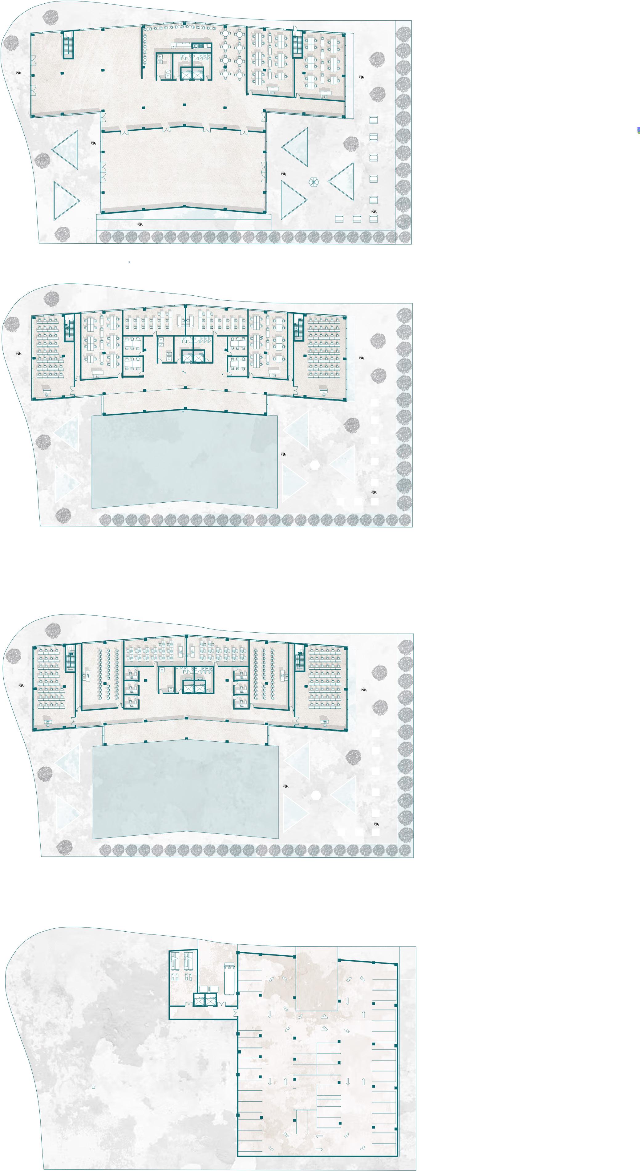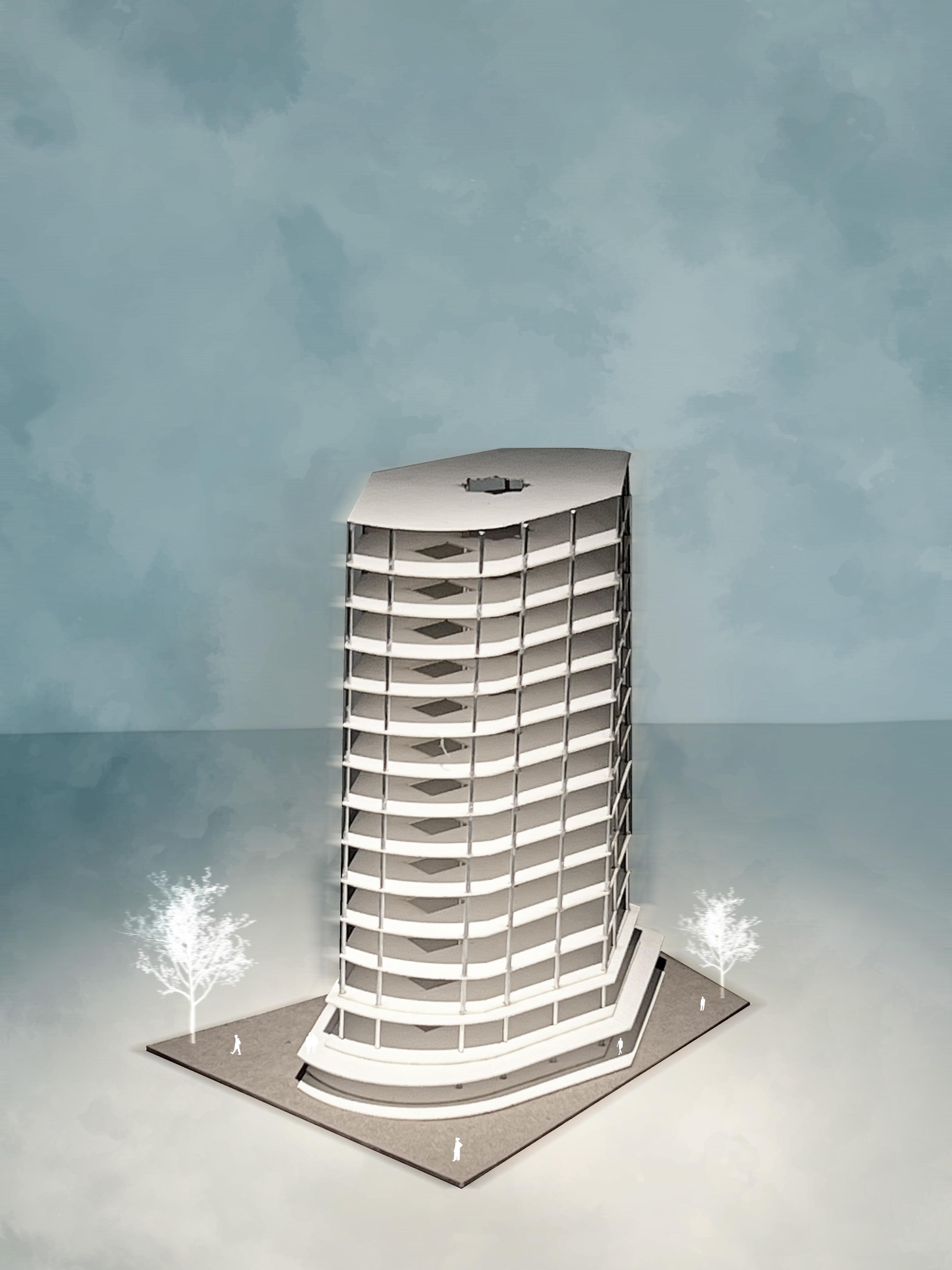 A UNIQUE FACADE OF TWISTED LOUVERS SURROUNDING THE BUILDING WHILE HAVING A WAVY SUBTRACTION FORM. THIS IN TURN OF THE AESTHETICS HELP THE INTERACTION OF THE PEOPLE IN THE BUILDINGS WITH NATURAL LIGHT BEING A CONSTANT SOURCE