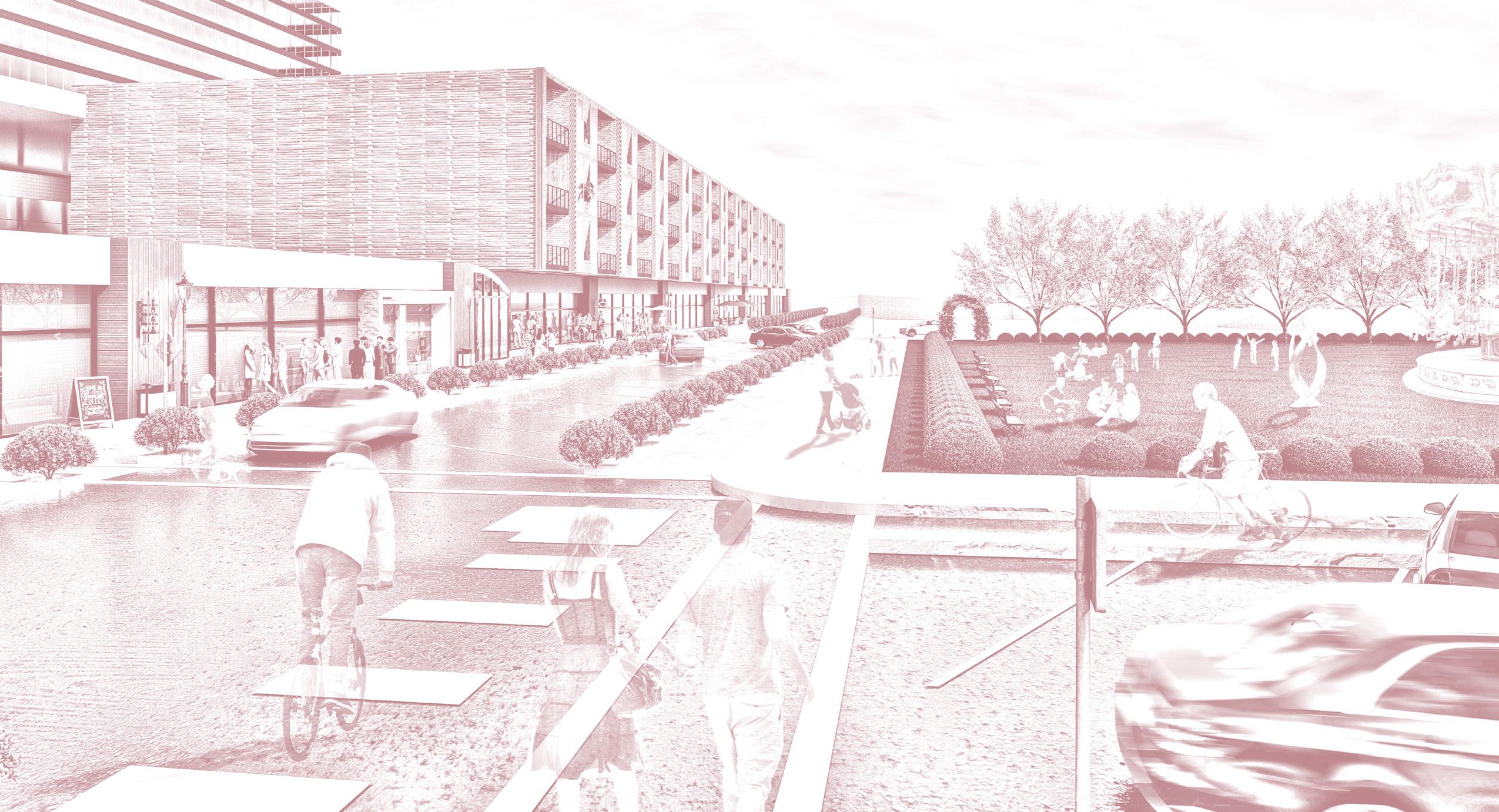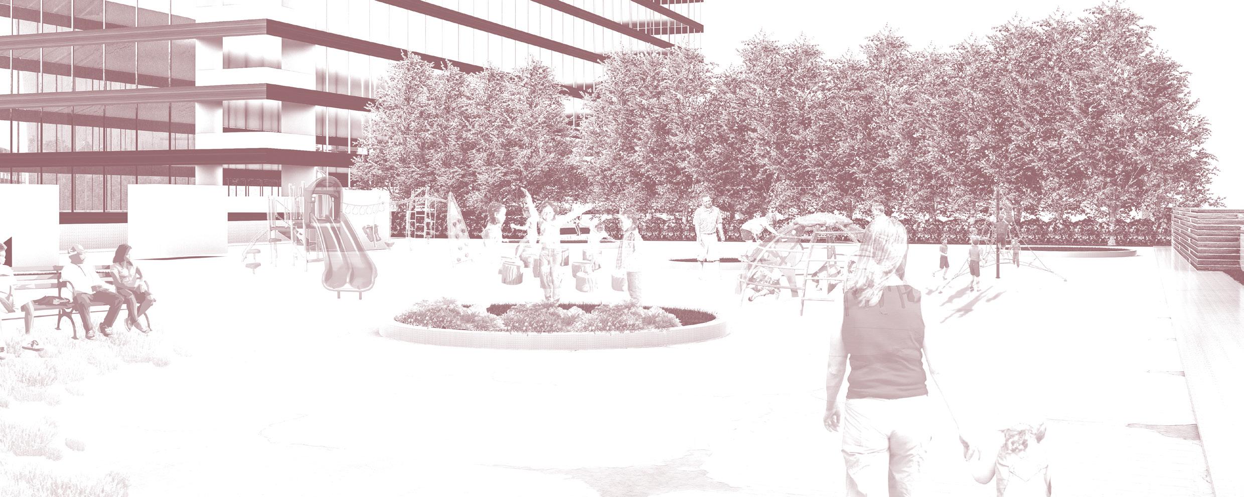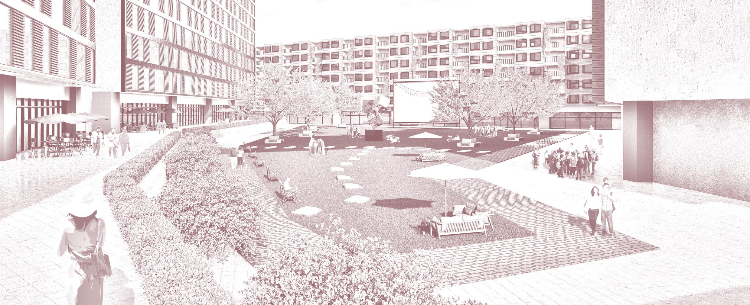 MIX-USE HOUSING TO BE CONNCETED WITH THE PLAZA. PLAZA CREATED TO DEDICATE SPORT USAGE. DEVELOPMENT OF A POCKET PLAZA SURROUDNED BY OFFICE BUILDINGS.