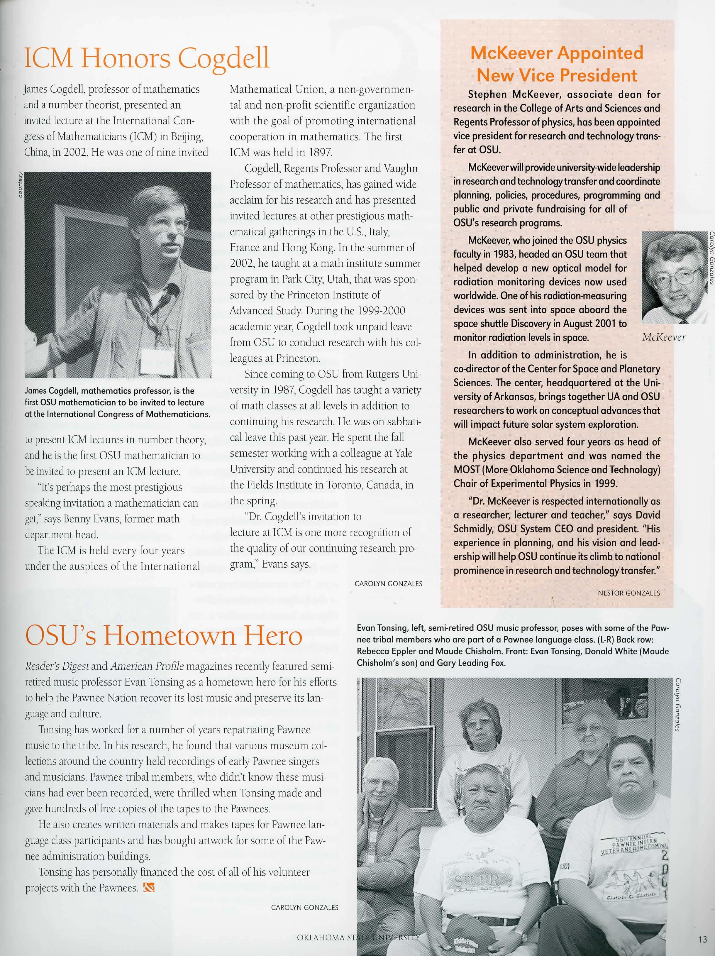 A recipient of two teaching awards, he has advised undergraduate and graduate students and served on a number of master's and doctoral committees as well as the university instruction council and the A&S honors committee. He has served as associate head of the Mathematics Department and adviser to the OSU Math Club.