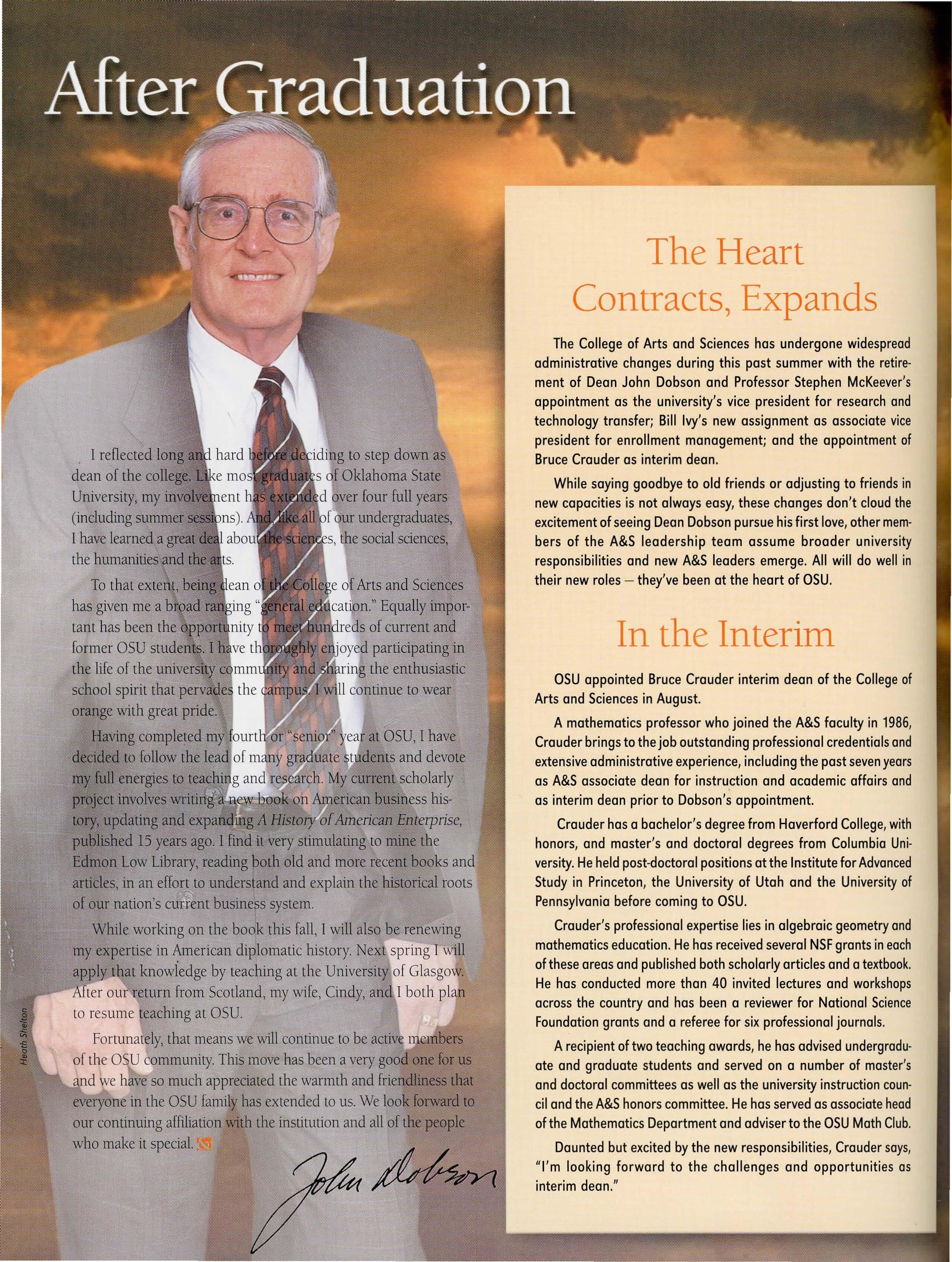 While saying goodbye to old friends or adjusting to friends in new capacities is not always easy, these changes don't cloud the excitement of seeing Dean Dobson pursue his first love, other members of the A&S leadership team assume broader university responsibilities and new A&S leaders emerge. All will do well in their new roles - they've been at the heart of OSU.