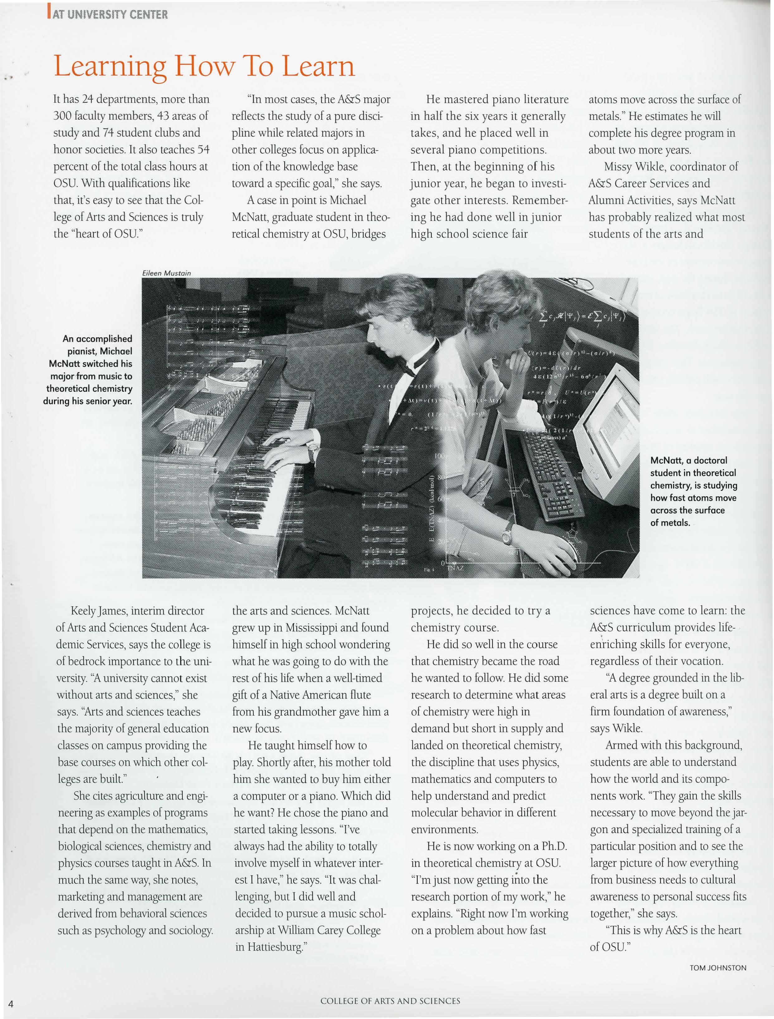 Curricular pursuits in both arts and sciences teach Michael McNett, a Ph.D.student in theoretical chemistry,an awarenessof the interconnectionsof cultural knowledge,personal success,vocation and avocation,giving him the foundation he needsto make informed choices about his future.