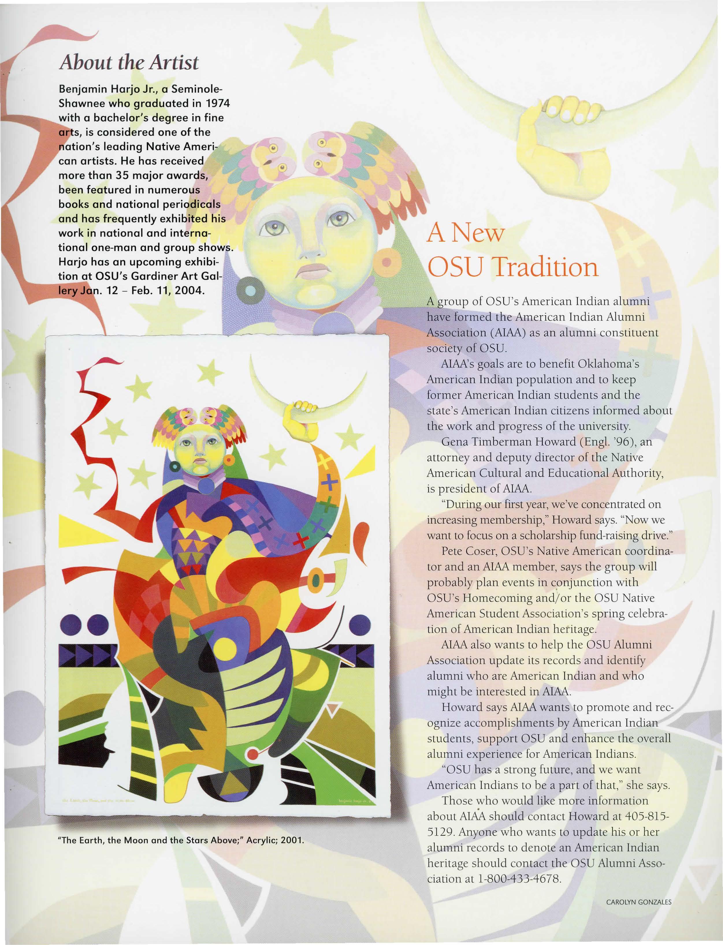 Benjamin Harjo Jr., a SeminoleShawnee who graduated in 1974 with a bachelor's degree in fine arts, is considered one of the ation's leading Native American artists. He has received more than 35 major awards, been featured in numerous books and national periodicals and has frequently exhibited his work in national and international one-man and group shows. Harjo has an upcoming exhibition at OSU's Gardiner Art Gal-
